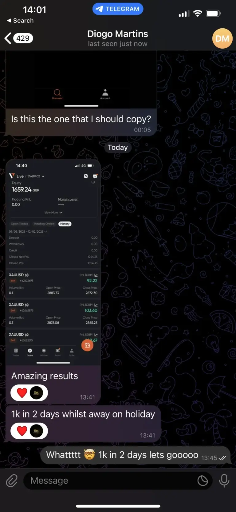 No experience? No problem! You can start making money right away by simply copying my trades live. It’s that easy—just copy, paste, and profit from Day 1. We’ve designed everything so you don’t need any prior knowledge to begin. 95% of our members have never traded before joining us.