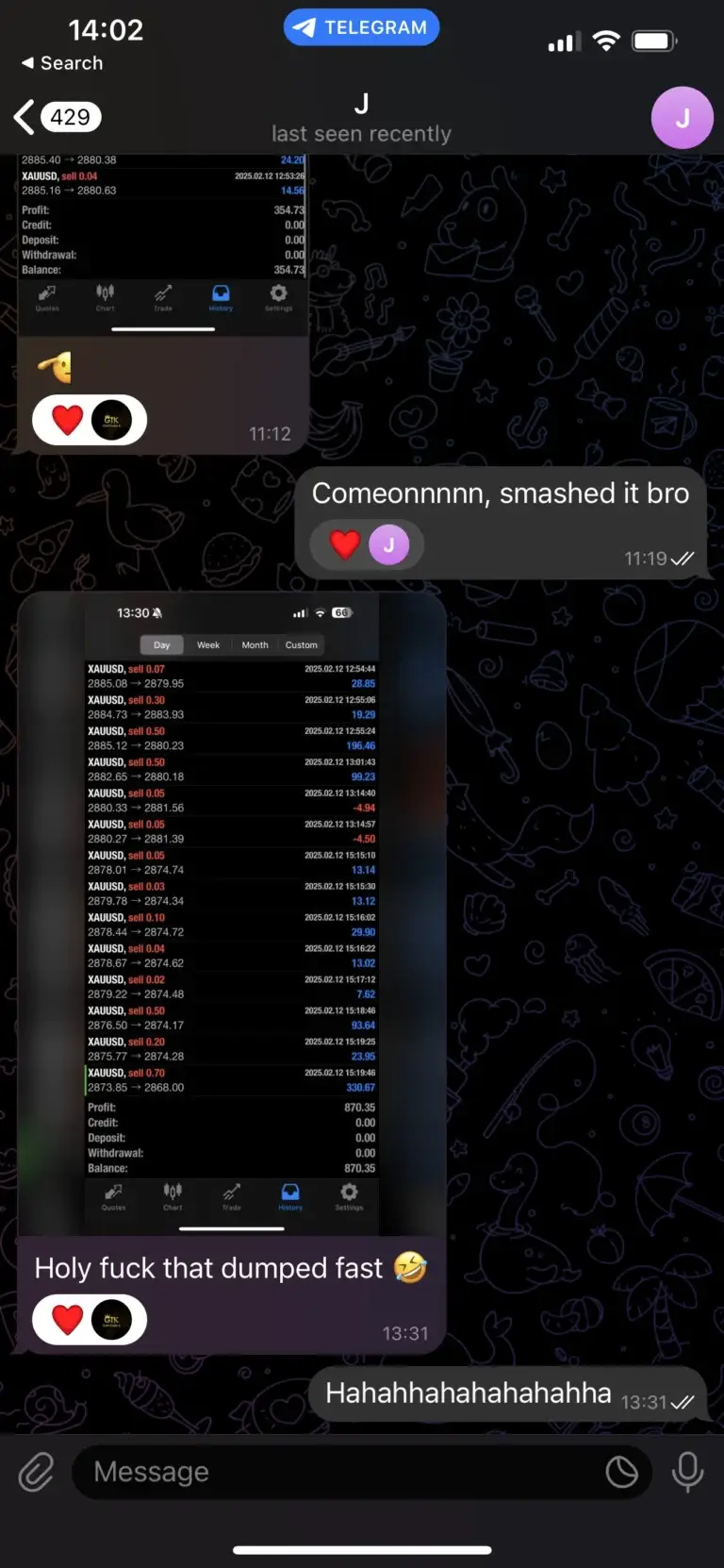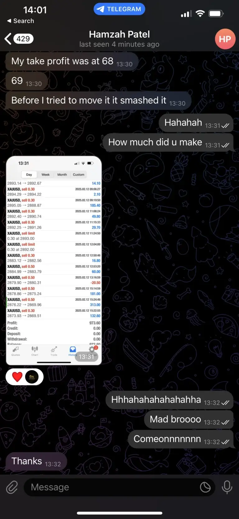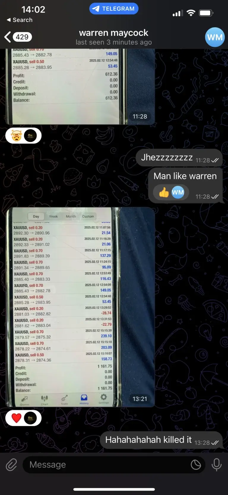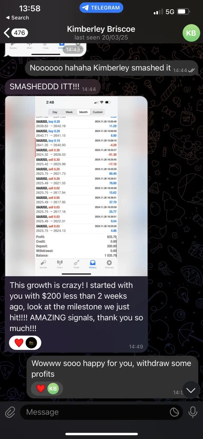 "Only started trading with Kay today and his experience in the markets along side his transparency makes understanding and placing his trades easy and quick so that everyone can make profit. I myself have already made a profit even though I only started today. Joining in on this will be the best decision you’ve made."